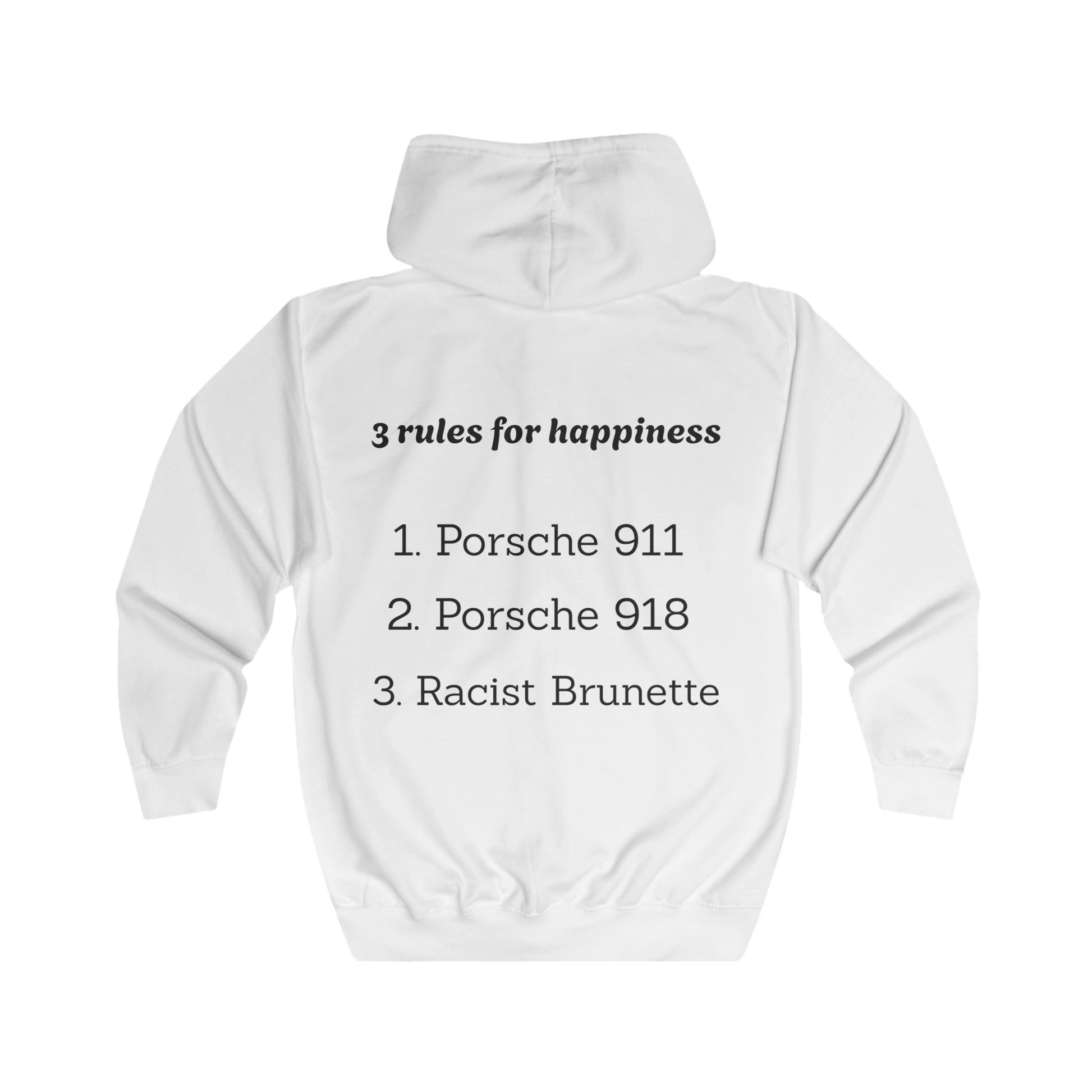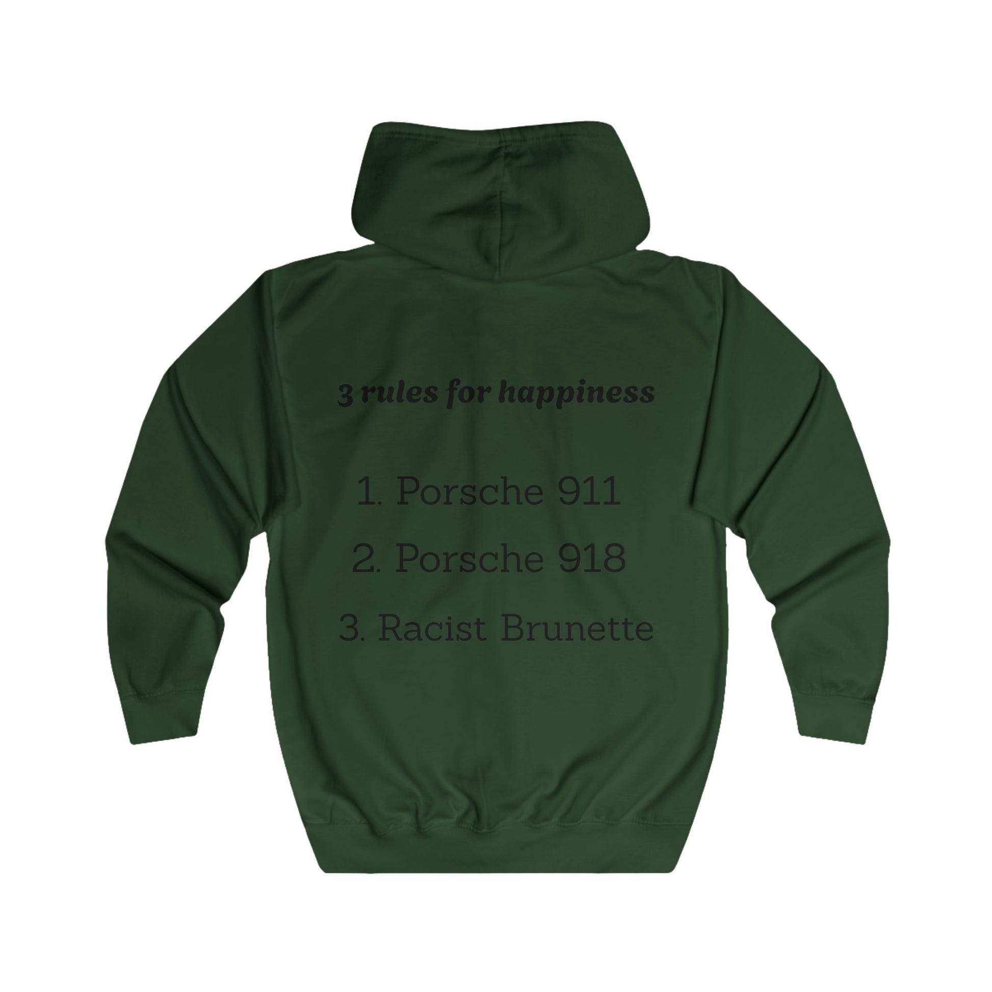 Zip Hoodie — "3 Rules for Happiness: Porsche 911, Porsche 918, Racist Brunette" Back Print